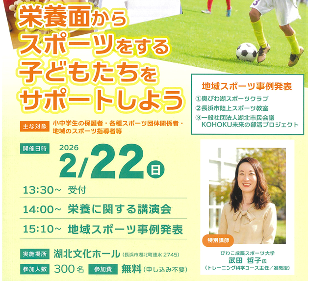 長浜市地域スポーツ推進事業「子どもたちの栄養に関する講演会・地域スポーツ事例発表」の開催について